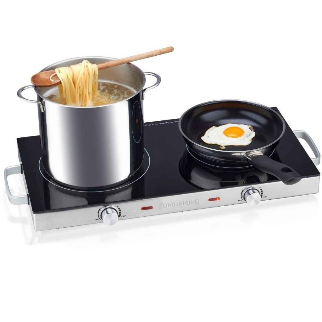 صفحه گاز دوشعله سرامیکی هنریچ آلمان مجهز به تکنولوژی اینفرارد، بدنه استیل ضد خش و صفحه سرامیکی توان یک شعله 1000 وات و شعله دوم 1800 وات مناسب جهت انواع ظروف
