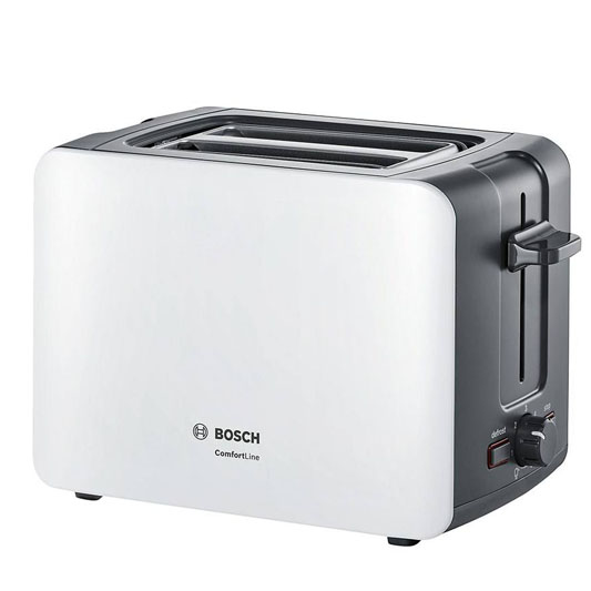 توستر بوش مدل TAT6A111 با دارا بودن تجهیزات استاندارد و مدرن قادر است انواع مختلف نان های شما را با بالاترین کیفیت برشته و گرم کند. این دستگاه ساخت کشور چین بوده و دارای توان مصرفی 1090 وات می باشد و قادر است به سرعت گرمای مناسب را برای برشته سازی نان آماده کند. توان به مراتب بالاتر امکان تنظیم حرارتی را بهبود داده و می توان از آن برای اجرای چندین کار مختلف استفاده کرد. مثلا با استفاده از توستر بوش مدل TAT6A111 می توانید علاوه بر برشته کردن، گرم کردن و یخ زدایی را نیز انجام دهید. پس این دستگاه چند منظوره می باشد و از دو درگاه و دو جای برش نان برخوردار است. رنگ بدنه دستگاه نیز با ظرافت خاصی انتخاب شده و به رنگ خاکستری تیره می باشد که در هنگام قرارگیری بر روی میز جذابیت خاصی به محیط آشپزخانه می دهد. توستر Bosch مدل TAT6A111 مجهز به قابلیت های زیادی بوده و یکی از آنها قطع اتوماتیک دستگاه می باشد که از سوختن نان جلوگیری می کند. در واقع در تمامی دستگاه های توستر شرکت بوش از یک سنسور الکترونیکی در داخل دستگاه استفاده شده است، تا میزان برشتگی را بررسی کند. یعنی در طول زمان سنسور موجود با توجه به میزان درجه بندی گرمایی که به دستگاه داده اید، بررسی را انجام داده و زمانی که به مرحله نهایی رسید، دستور قطع خودکار را صادر می کند. همچنین گزینه ای به نام STOP نیز بر روی بدنه قرار دارد که قبل از برشته سازی کامل می توانید دستگاه را دستی متوقف کنید. توستر بوش مدل TAT6A111 نسبت به مدل های پیشین خود دارای قابلیت های بیشتری می باشد. همچنین وزن دستگاه ایده آل تر شده و 1.86 کیلوگرم می باشد که تکیه گاه مطمئنی را در هنگام کار به وجود می آورد. همچنین مجهز به پایه های ضد لغزش بوده و موجب سر خوردن دستگاه نخواهد شد. از قابلیت های برجسته این دستگاه می توان به موارد زیر اشاره کرد: قابلیت Defrost (یخزدایی) در مدل های پیشین نظیر TAT3A017 دکمه کنترلی و تنظیم دما خاص موجب یخ زدایی می شد. اما در این مدل از یک دکمه مجزا با عملکرد بهینه برای انجام این کار استفاده می شود. از این رو نان و یا شیرینی طعم طبیعی خود را حفظ خواهد کرد. تنظیم حرارت توستر بوش مدل TAT6A111 مانند مدل های دیگر امکان تنظیم حرارت در 6 درجه را با استاندارد بالا دارا بوده و برشته سازی را در حد مطلوب و به دور از هر نوع خشک سازی نان انجام می دهد. همچنین می توانید با تنظیم درجه حرارت انواع کلوچه و شیرینی های رولی را به خوبی گرم کنید. سینی جهت جمع آوری خرده نان این دستگاه به مانند دیگر دستگاه های قبلی خود مجهز به سینی برای جمع آوری خرده های نان می باشد. بعد از هر بار گرم و برشته سازی نان حتما کشوی سینی را بیرون کشیده و آن را خالی و تمیز کنید و دوبار در جای خود قرار دهید. زیرا این کار مانع از دوباره برشته شدن خرده های نان شده و از سوختن آن جلوگیری می کند. اگر تمیز سازی سینی را انجام ندهید سیاهی حاصل از سوختن نان هم موجب گرفتن بوی بد شده و هم تمیزی سینی را دشوار خواهد کرد. انواع دکمه در توستر بوش مدل TAT6A111 در این دستگاه چندین دکمه به منظور راحتی کار کاربر طراحی شده است. استفاده از دو دکمه کناری در دو طرف دستگاه به منظور بالا و پایین آوردن نان در دستگاه می باشد. زمانی که نان شما برشته و داغ شد با بالا آوردن اهرم می توانید راحت تر نان را بردارید. دکمه توقف به منظور پایان دادن به عملیات که دارای نشانگر نیز می باشد. دکمه ولومی برای تنظیم حرارت و برشته سازی در 6 حالت را دارا است. دکمه Defrost هم که کار یخ زدا را انجام داده و مجهز به نشانگر می باشد.